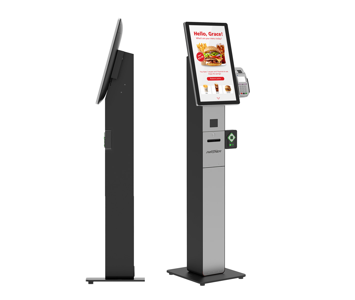 El Alfred PS-137 es altamente personalizable mediante una amplia gama de periféricos opcionales, como escáner de códigos de barras 2D, teclado ADA, lector RFID, indicador LED de estado y soportes para terminales de pago. Su soporte de pago opcional se acopla directamente a la pantalla y es compatible con la mayoría de los terminales líderes del mercado, creando una solución completa para pedidos y pagos de autoservicio rápidos y sin fricciones.